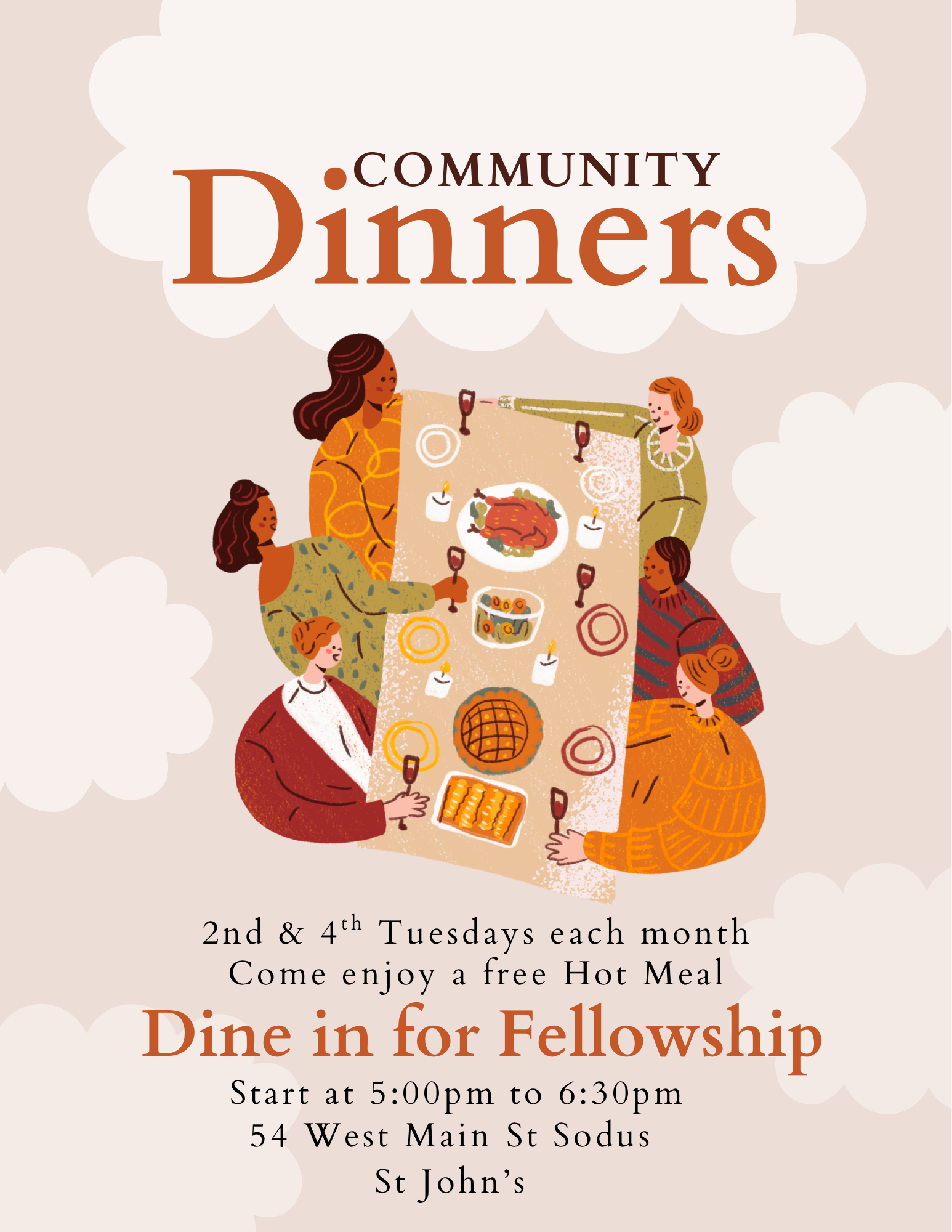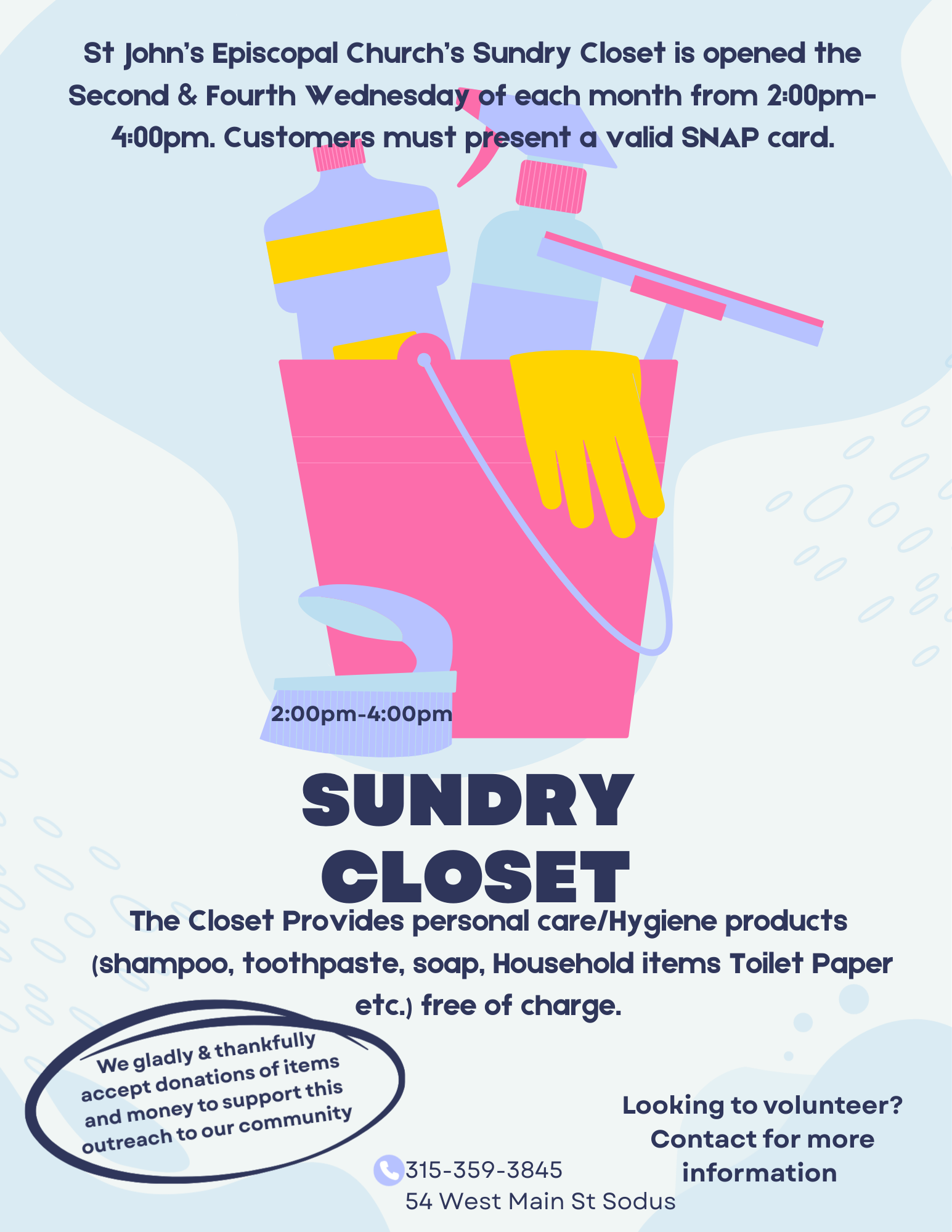 We are proud to serve the Sodus community in several ways, including Community Dinners, a free hot wholesome meal offered twice monthly, The Clothesline, providing gently used clothing for little or no cost, and the Sundry Closet, providing personal care items not covered by the SNAP program. We also support the Sodus Point Food Cupboard with food donations from our congregation. The Women of St. John's is the Outreach arm of the church. This active and vibrant group of women organizes fundraisers and contributes to local nonprofits doing good work in the community in the name of St. John's. We would love to have you join us in service. See the flyers below for more information or to join us as a volunteer!Click to Enlarge
